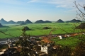 云南省市罗平县丘陵中遍布石林,它们点点缀于漫山遍野、黄灿灿的油菜花海中,可以很自然的构图。红褐色的云南泥土铺排,混合着零散的村镇和碧绿的稻田,而农夫和耕牛在地里忙着,一片和谐画面自然的流露着。